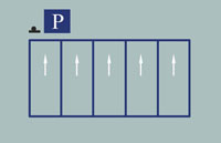 图中的每个车位内都有箭头标明了方向,表示车辆只能按照固定的方向停车,答案选固定停车方向停车位。