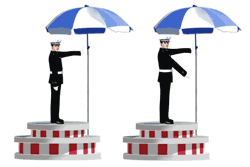 图中交警左手平举,右手摆动指向我们的右边,答案是右转弯信号。