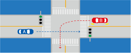 如图所示,A车具有优先通行权。